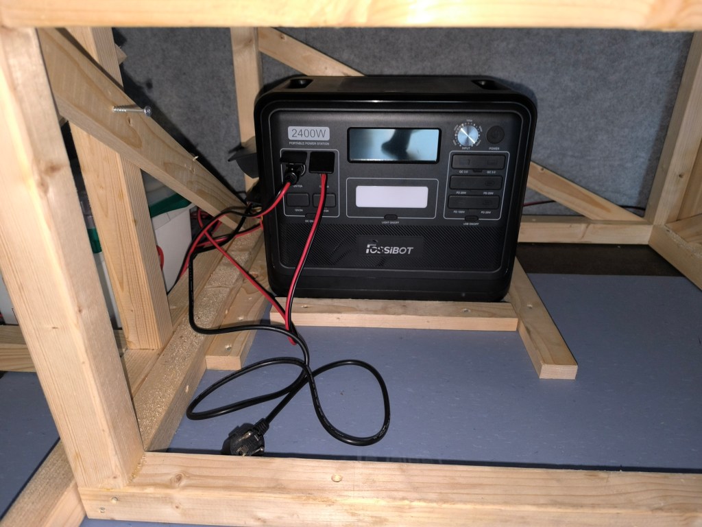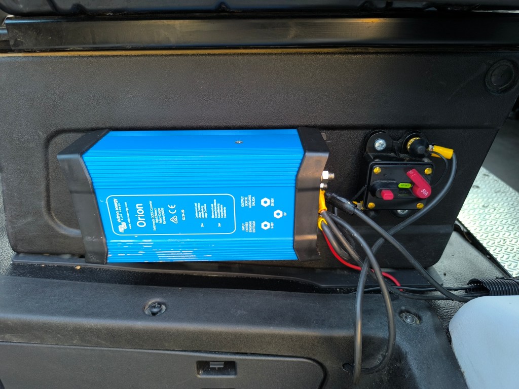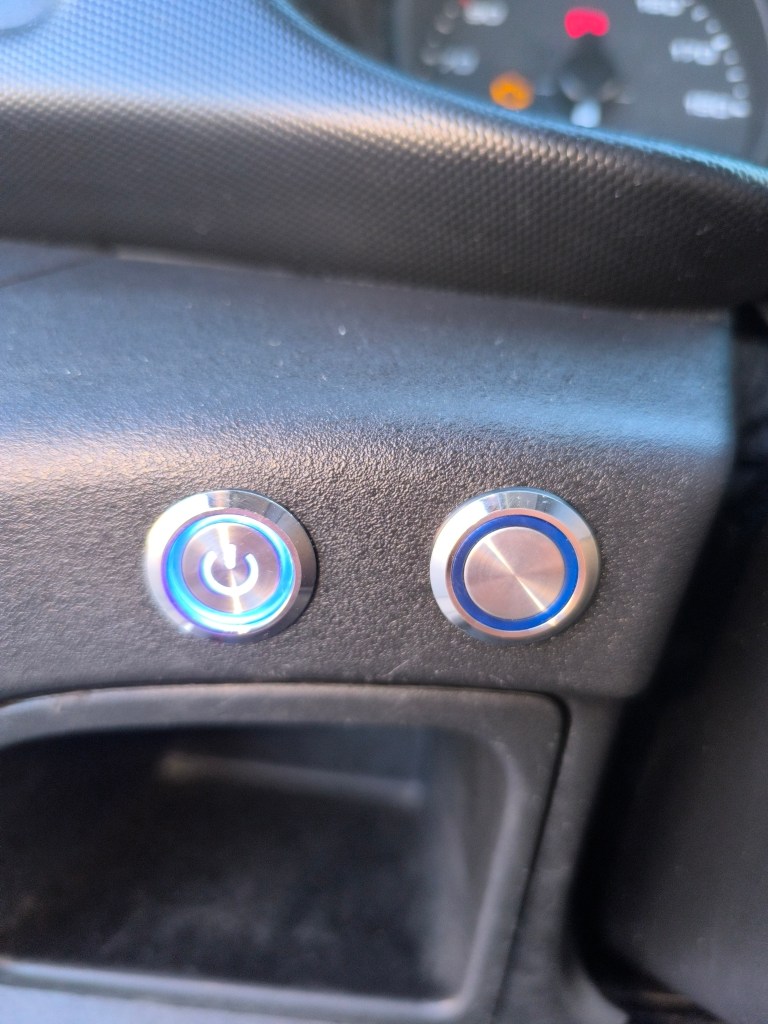 Nadien schakel je ook het 12V circuit in door middel van het rubberen knopje links vooraan op de batterij, onder de 2 stekkers.