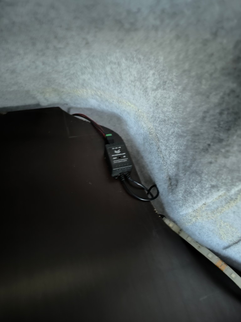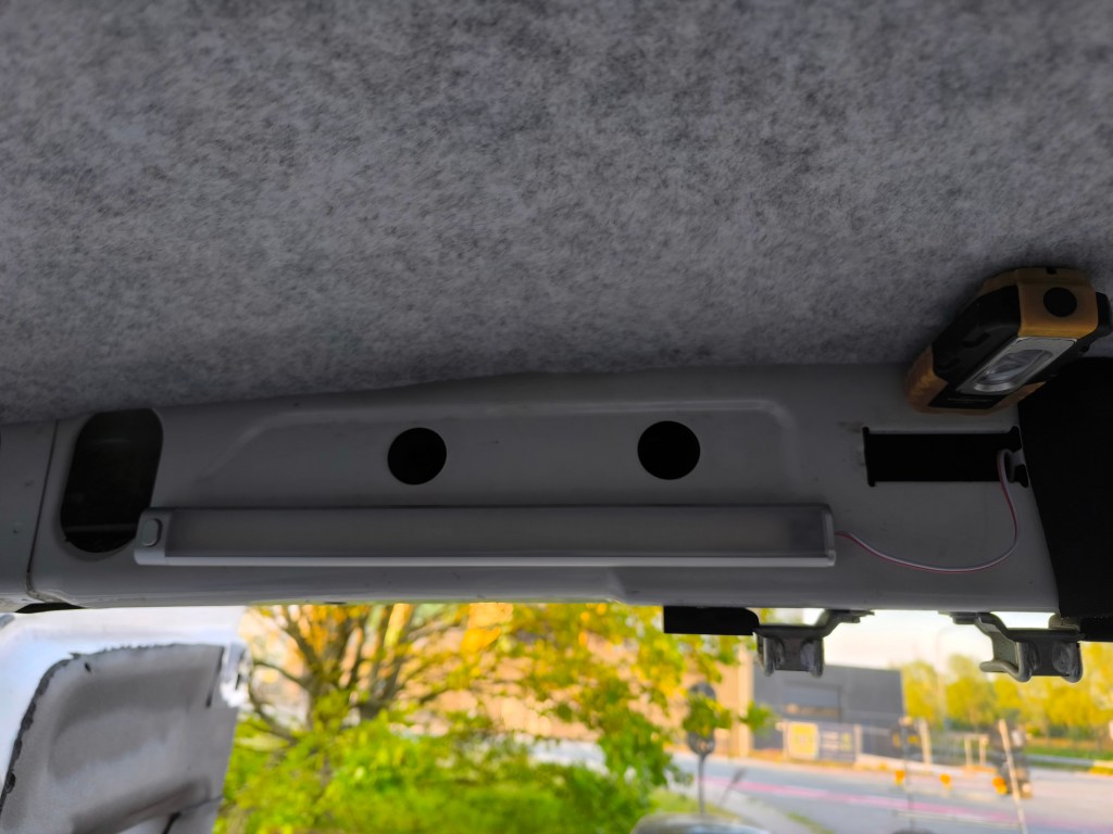 Boven de rechter achterdeur hangt een ledlamp die is aangesloten op de startbatterij. Handig om licht te hebben in het woongedeelte wanneer de woonbatterij nog uit staat. Ook handig om de startbatterij te legen wanneer je graag eens 3500kg vooruit wil duwen. Geen krachtpatser? Denk eraan om het lampje altijd snel uit te schakelen.