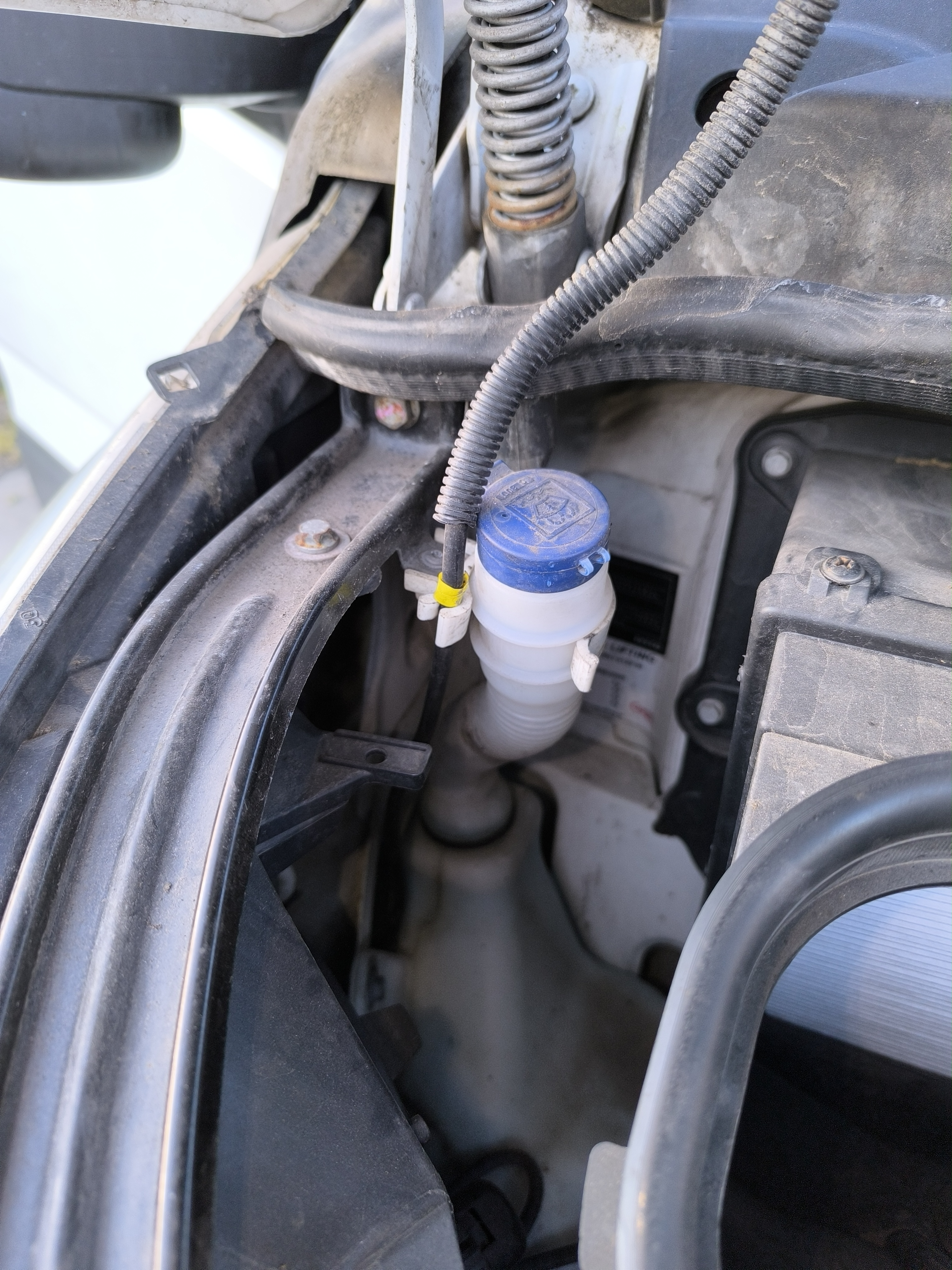 Hier kan je de ruitenvloeistof bijvullen indien gewenst. Je vertrekt steeds met een heel goed gevuld reservoir. Enkel door overmatig sproeien kan je tekort komen.