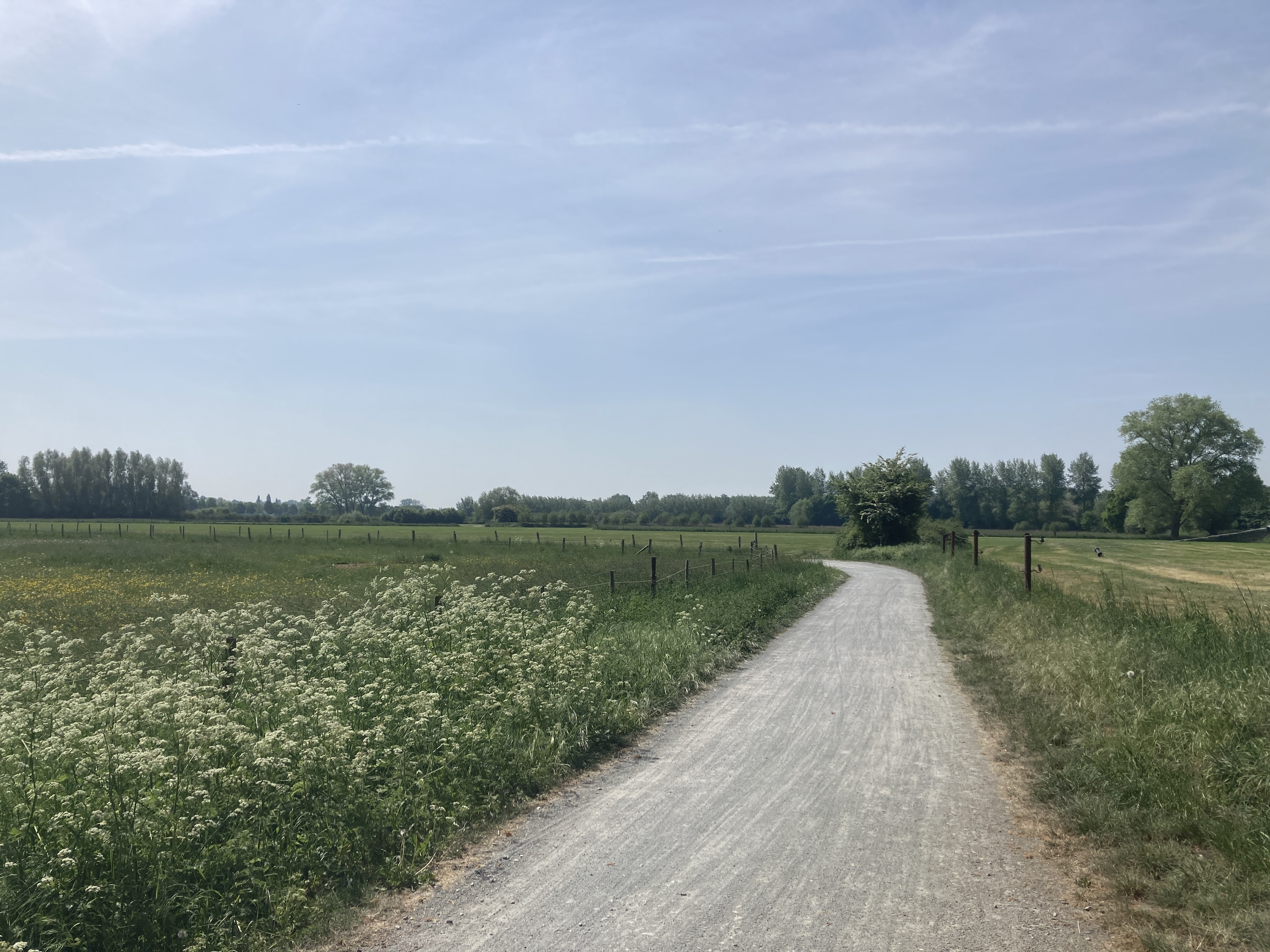De route gaat verder langs de Gentbrugse Meersen. Dit uitgestrekte natuurgebied is een van de groene longen van Gent, en dat voel je. Graslanden, poelen en bossen wisselen elkaar af. Het brede fietspad kronkelt doorheen het landschap en biedt prachtige vergezichten. Hier en daar passeer je wandelaars of andere fietsers, maar de sfeer blijft gemoedelijk en rustig.
