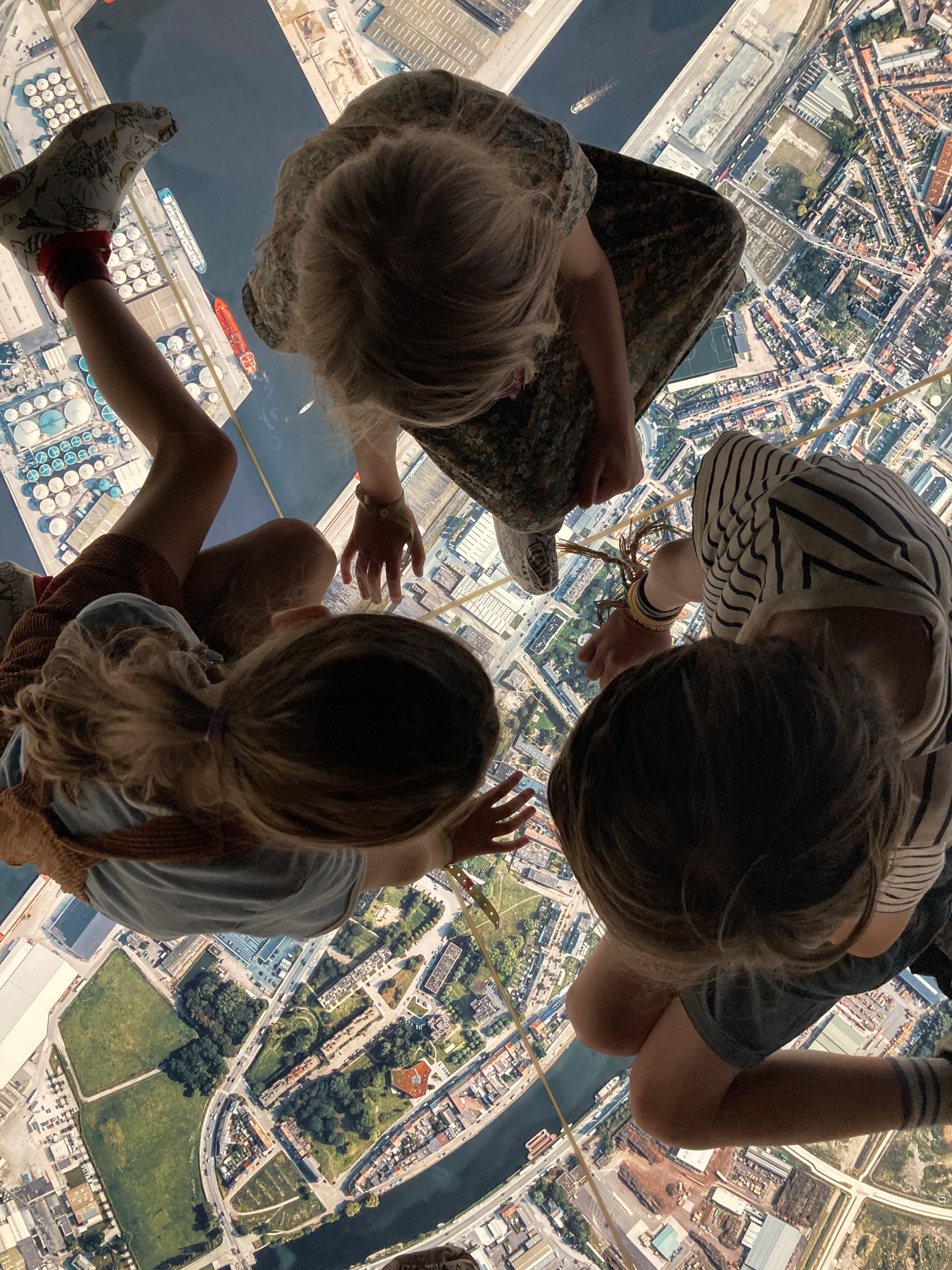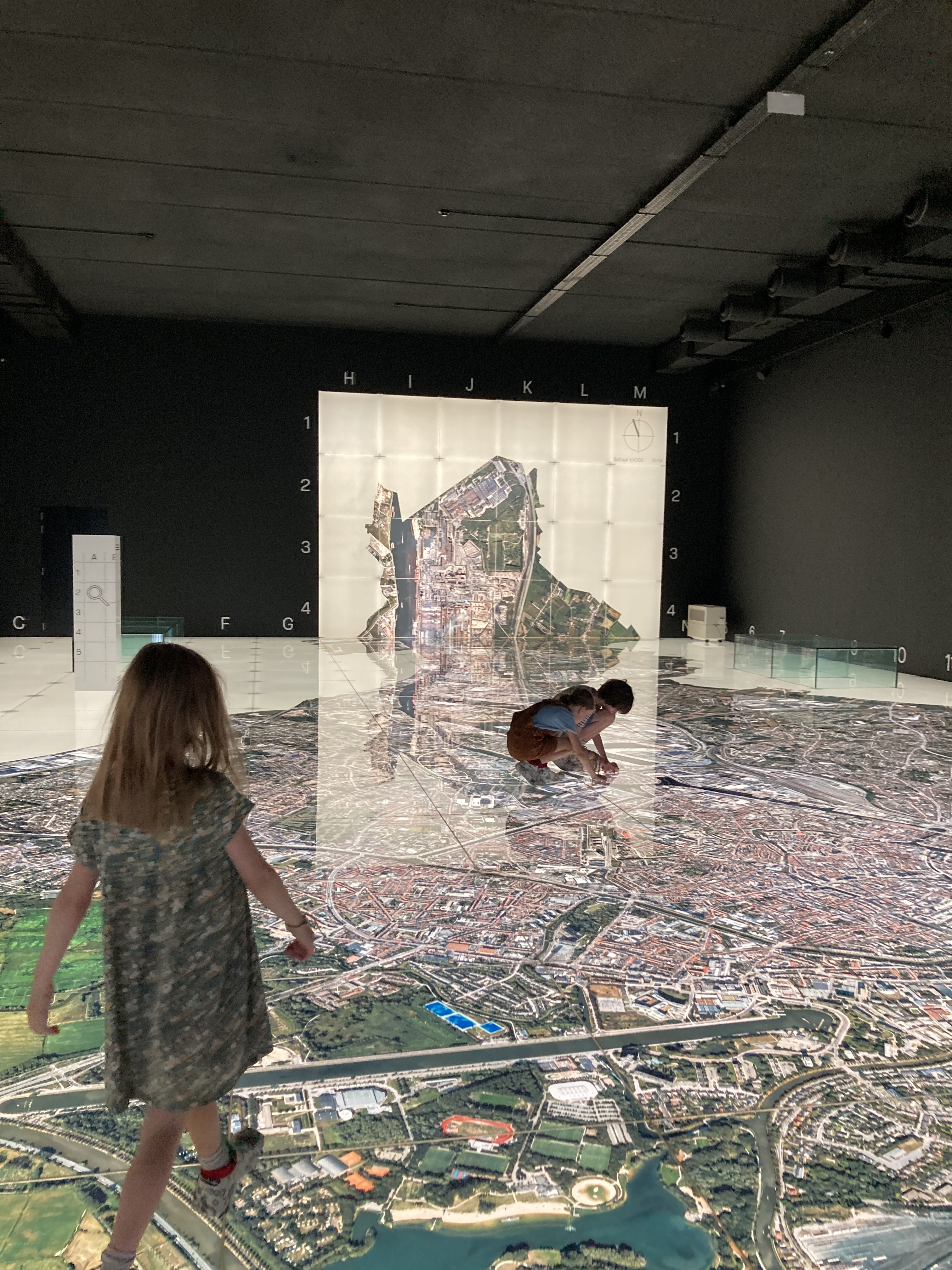 Niet te missen is ook de gigantische luchtfoto van Gent die als vloer dient in één van de zalen. Wij zochten samen naar ons huisje en de school van de kinderen.