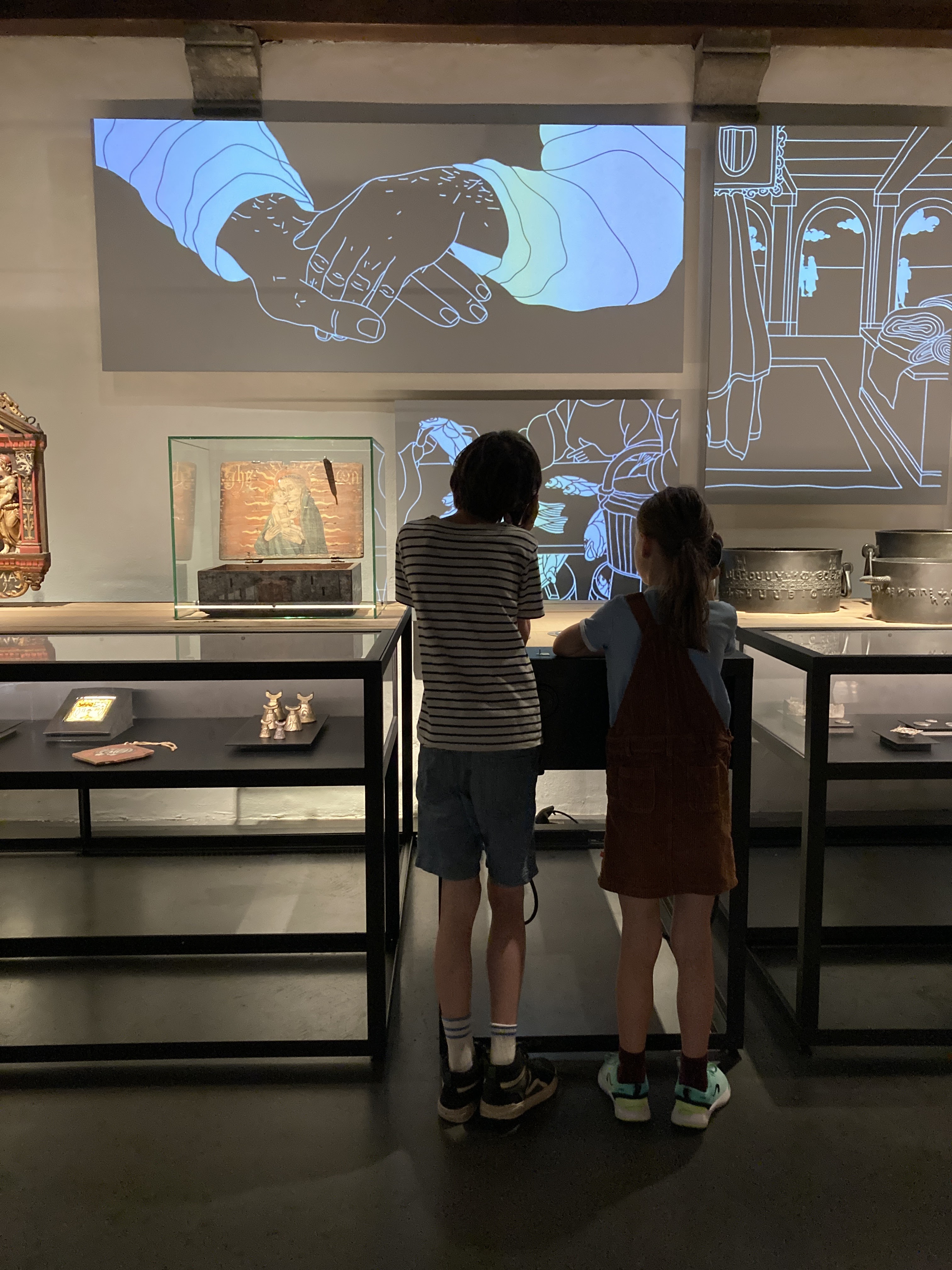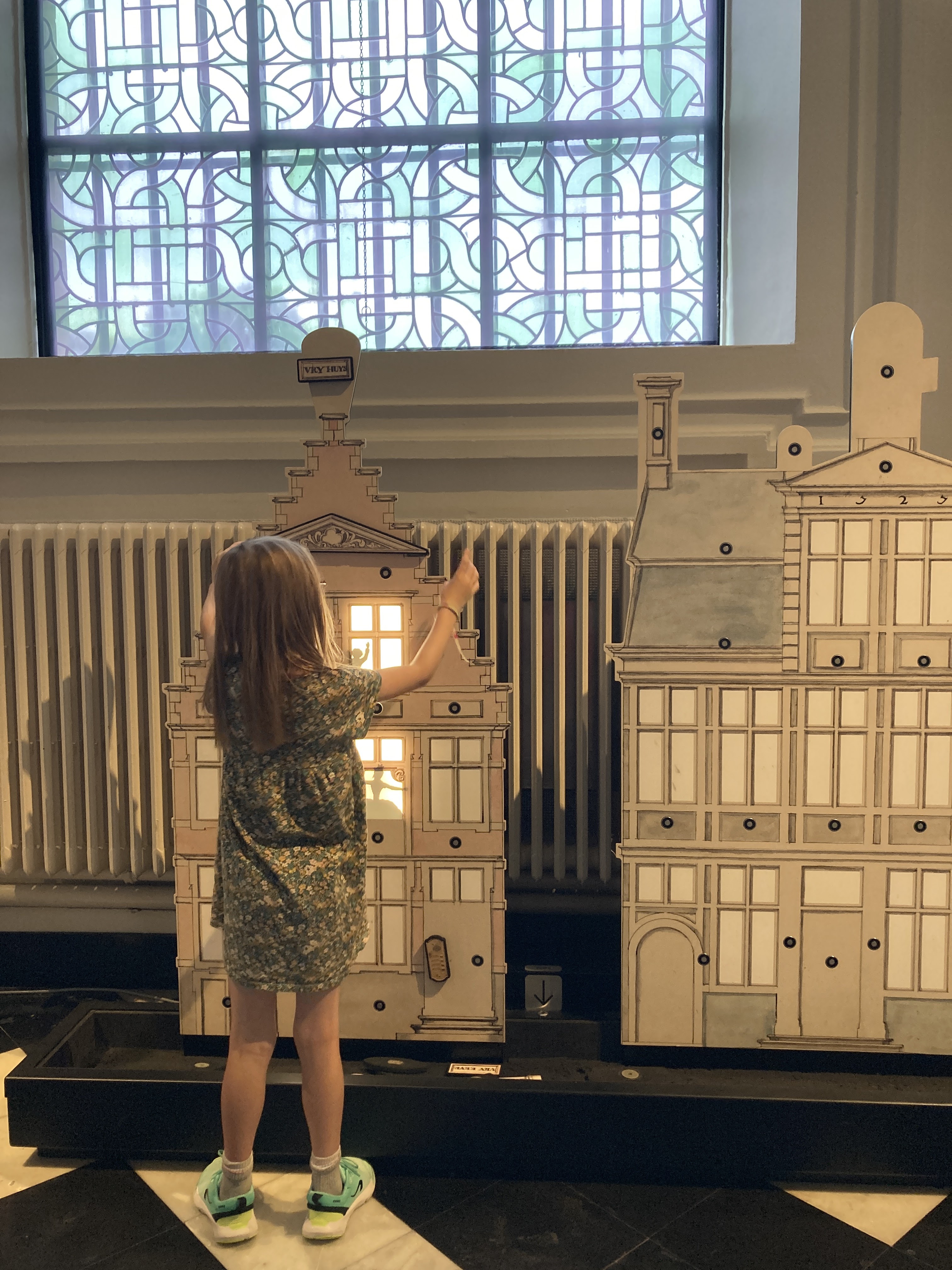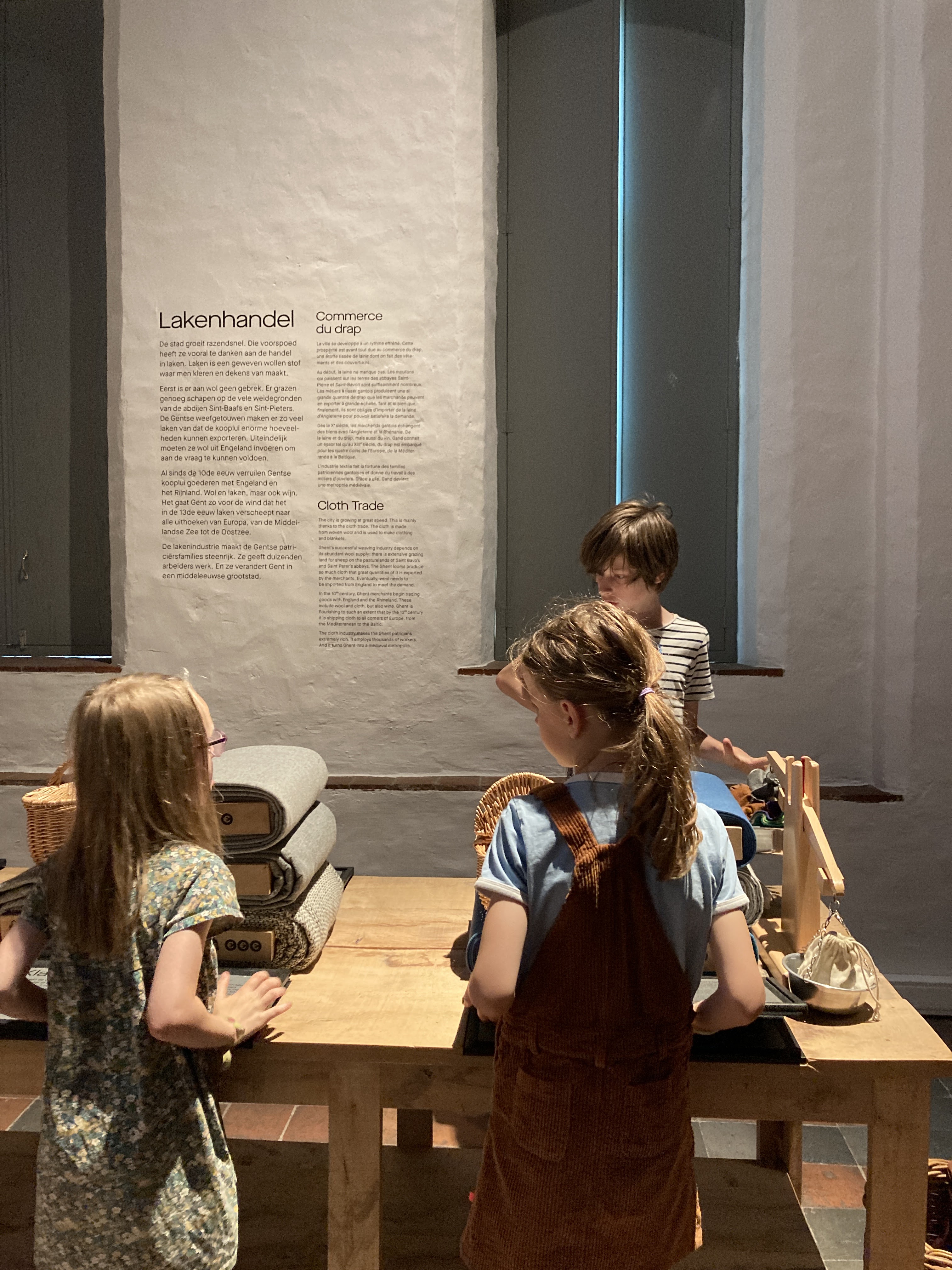Het kinderspoor is een aparte route door het museum met kindvriendelijke uitleg en kleine opdrachten. Echt ideaal om hun aandacht vast te houden, ook bij de meer historische stukken. Zo konden ze de onderhandelingen op de lakenmarkt naspelen en ontdekten ze het schild van de verschillende ambachten.